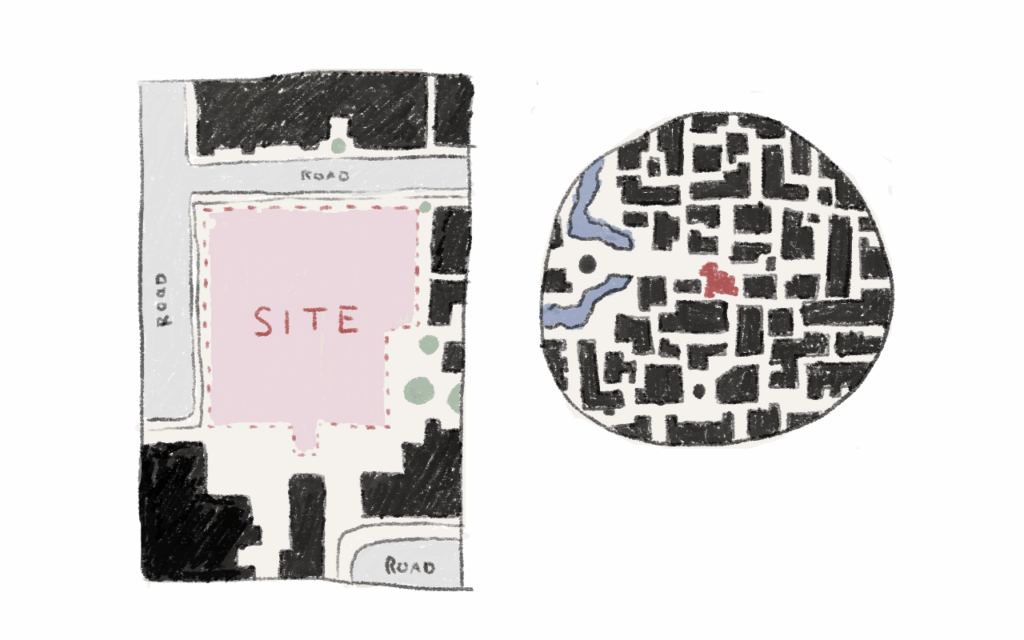 You’ll need a wider context map that shows the city or landscape you’re building in (around 1:1500 or 1:2500) to use for site analysis. You’ll also need a site map that you can use as a base layer to design on (around 1:200 or 1:500).